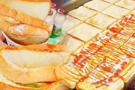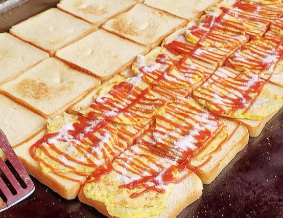 고소한 식빵 위에 달걀부침, 케첩 듬뿍! 시장 상인들의 출출한 배를 채워주고 있습니다