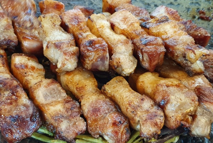 이 부위는 껍질, 지방, 살코기가 번갈아 층을 이루며 겹겹이 두텁게 구성되어, 씹을수록 고소하고 쫄깃한 맛이 특징입니다.