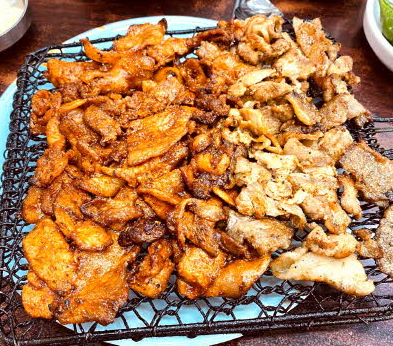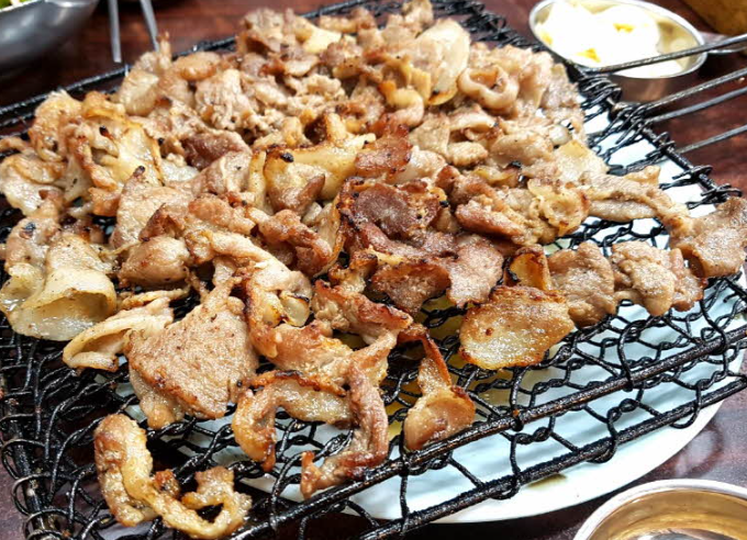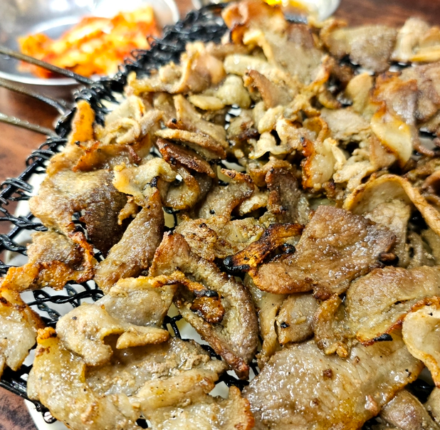 대표 메뉴인 '석쇠 돼지 불고기'는 달콤한 양념에 재운 얇은 돼지고기를 연탄불 위에서 빠르게 구워내어, 석쇠 위에 그대로 제공됩니다.
