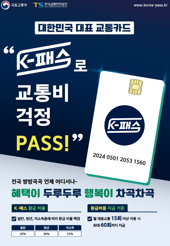 국토교통부 대도시권광역교통위원회는 24일부터 K-패스 카드 발급을 시작한다고 21일 발표했습니다. K-패스는 다음 달 1일부터 사용할 수 있으며, 월 15회 이상 대중교통(시내·마을버스, 지하철, 광역버스, GTX 포함)을 이용하는 경우, 사용 금액의 일정 비율을 환급받게 됩니다. 환급 비율은 일반인 20%, 청년층 30%, 저소득층은 53%입니다. 또한, 참여 카드사별로 카드 이용 실적에 따라 추가 혜택을 제공할 예정입니다. K-패스 혜택을 받기 위해서는 K-패스 카드 발급 뿐만 아니라, 알뜰교통카드 회원으로 전환하거나 K-패스에 신규로 가입하는 절차를 반드시 진행해야 합니다.k패스 카드 발급방법 신청방법 및 혜택 안내 자세한 정보 확인 하시기 바랍니다
