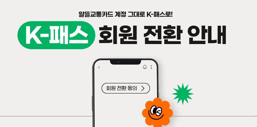 2024년 5월 1일부터 K-패스가 시행됩니다. 이에 따라 이용 방법을 안내드리오니 참고하시기 바랍니다.기존 알뜰 사용자 는 알뜰 계정 그대로 이용하고 싶다면 회원 전환을 반드시 해주세요